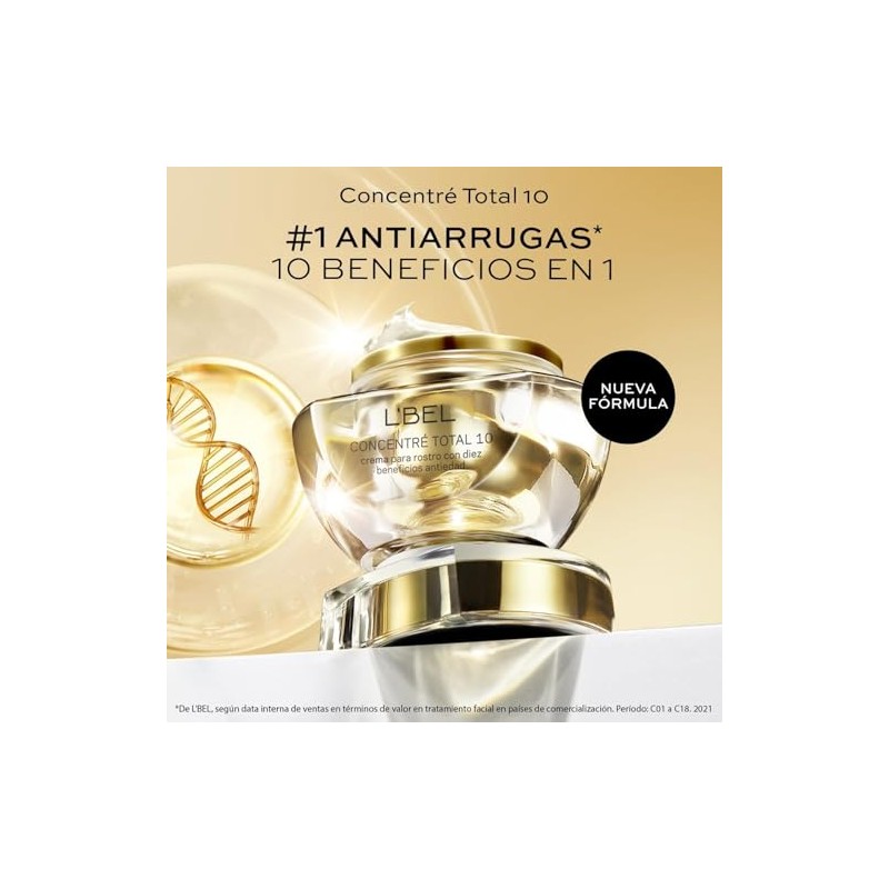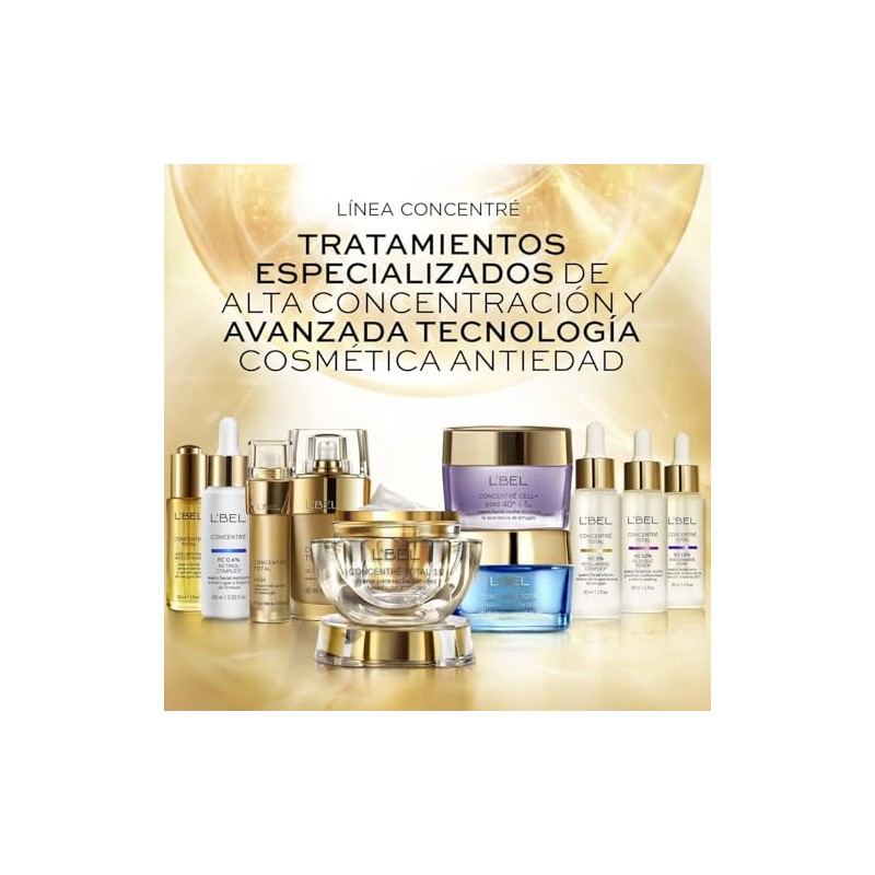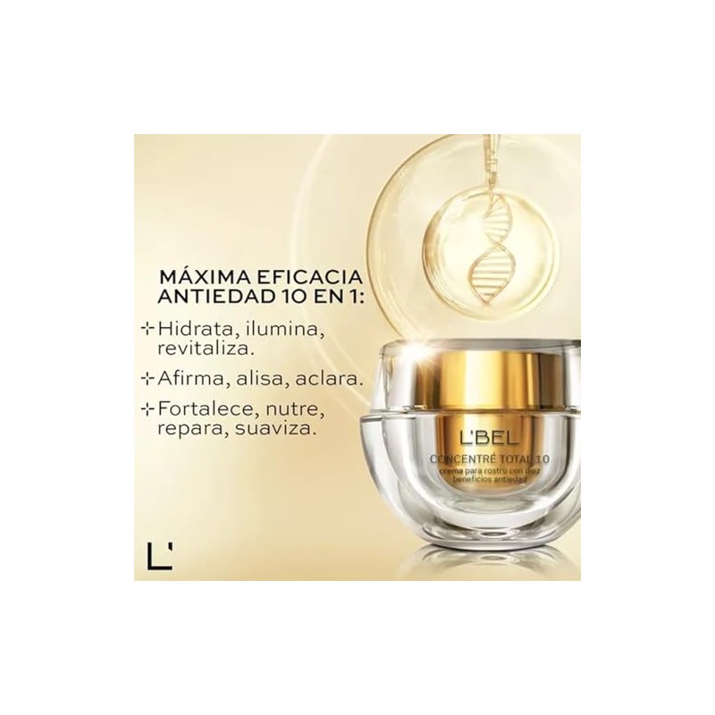 Acerca de este artículo PACK CONCENTRÉ: El pack Concentré de L'Bel contiene una crema hidratante Concentré Total 10 Cconcentrado facial antiedad y Concentré Total crema para contorno de ojos. ¡Es un pack ideal para ti o para regalar! CREMA ANTIEDAD: Concentré Total 10 es una crema antiarrugas y antiedad Concentré Total identifica y se adapta a las necesidades únicas de tu rostro para hacerlo todo por tu piel. Crema hidratante que ilumina, revitaliza, afirma, alisa, aclara, fortalece, nutre, repara y suaviza. CREMA CONTORNO DE OJOS: Es una crema para el contorno de ojos que rejuvenece la mirada desde la primera aplicación con su tecnología inteligente, que le brinda a esa zona de tu rostro más proteínas antiedad. TECNOLOGÍAS: La crema para rostro cuenta con diez beneficios antiedad y con la nueva tecnología Genetic Complex. La crema gel para contorno de ojos cuenta con la tecnología Adaptive Complex con acción epigenética, que se fusiona con el ácido hialurónico para un doble efecto. Efecto lift, que mejora el párpado caído y un efecto Megafill, que mejora inmediatamente la apariencia de arrugas. L'BEL: Nació con la gran misión de cuidar de ti y de tu piel, retando el futuro, desafiando el tiempo y factores externos. El cuidado y la salud son nuestra prioridad; la ciencia y alta tecnología son nuestras aliadas; y la belleza, nuestra razón de ser