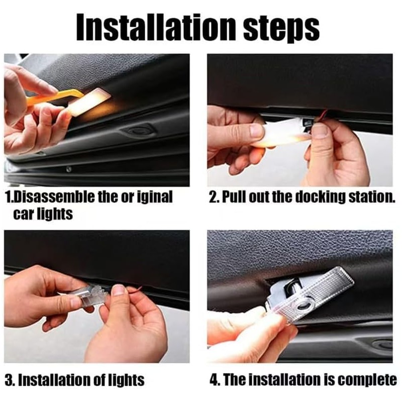 - Installation: Use a flat head screwdriver or tool to remove the existing door light. Insert our welcome light tag through the connecting cable. The entire installation process only takes 2 minutes.