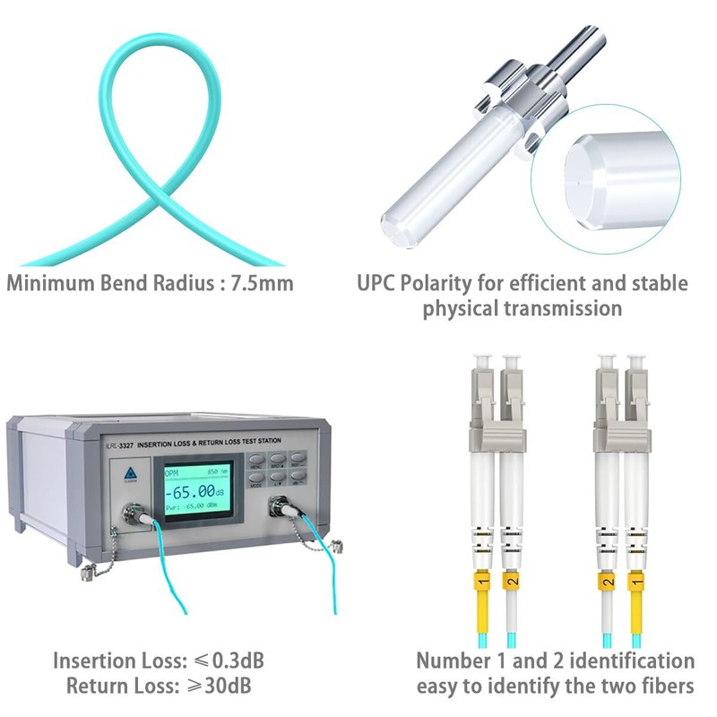 - ๐ฆใWhy to ChooseใOM3 LC to LC multimode fiber optic patch cables are Constructed with LSZH environmentally friendly Jacket. Fiber cables Insertion Loss: โค0.3dB, Return Loss: โฅ30dB, operating temperature: -20~70ยฐC. Optimum IL and RL of the Zirconia Ceramic Ferrule ensures a stable signal transmission(Accordance with EIA/TIA 604-2, 100% inspected), bend radius at 7.5mm, enables smaller enclosures and provides a smooth and stable transmission for your network.