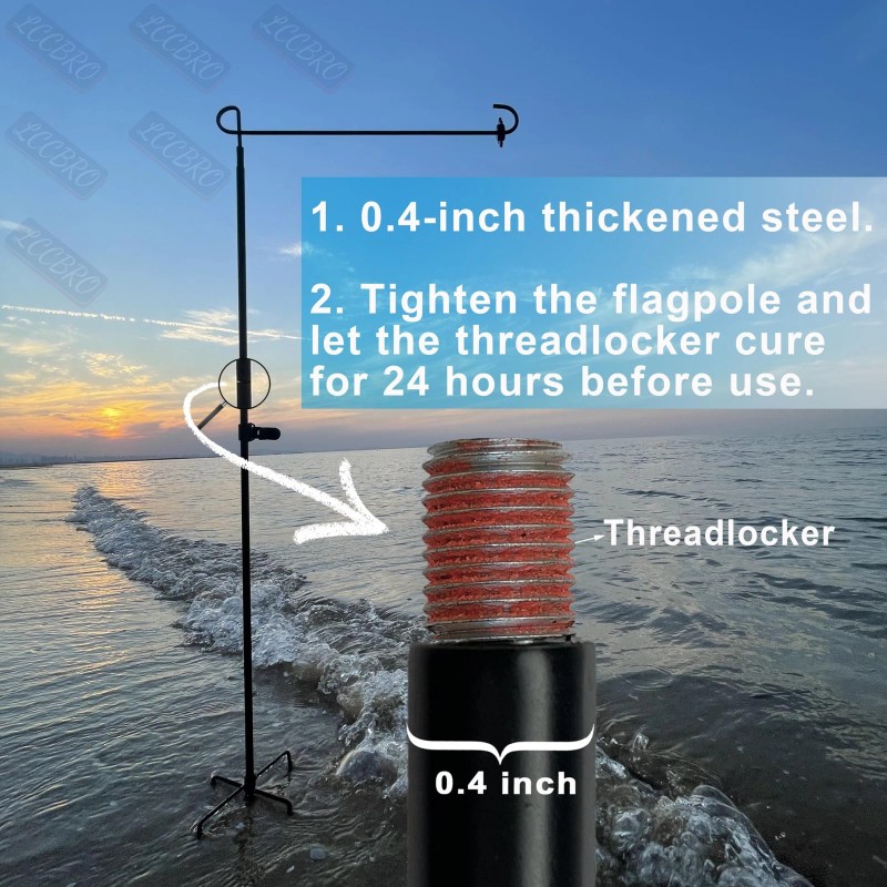 Apply Threadlocker. Crafted from strong 0.4-inch thickened steel pipe, our flagpole is built to prevent bending or breaking. We use extended threads and apply threadlocker to minimize the chance of spinning in the wind, ensuring a secure display for your flag.