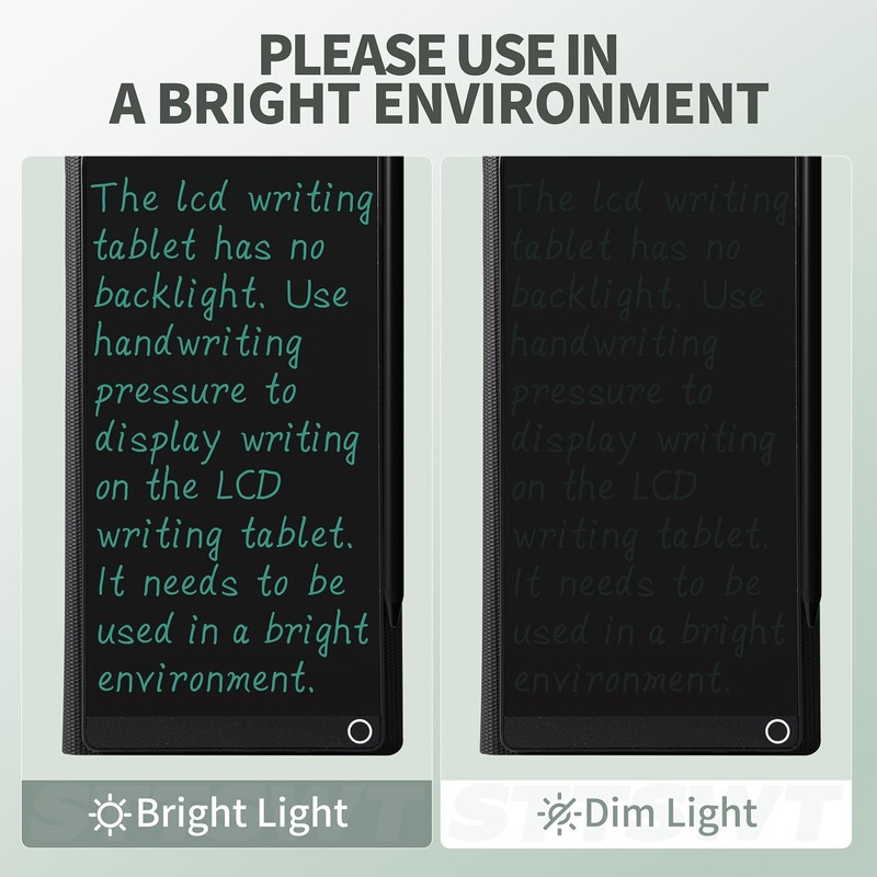 - 2 Ways to Clear: In addition to the LCD writing board with one click to clear the screen, new non-touch screen clear mode; Hold one end of the magnetic stylus near the circle on the front of the tablet, and the content on the screen will be immediately cleared; You need to open the lock screen button to use the clear function