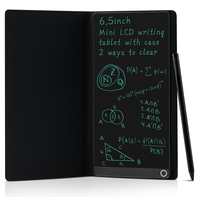 - High-quality LCD Writing Tablet: 6.5 inch writing tablet with leather case, can prevent the screen from being scratched; The writing screen is 93.5% of the screen; More comfortable to record, communicate, study, work; Measuring just 0.4 inches thin and weighing only 0.2 pounds; It is about the size of a mobile phone; So it can effortlessly fit into school bags, handbags or travel bags