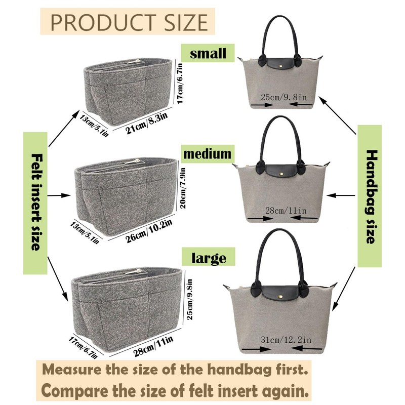 - NOTE: If the insert size matches your bag,long*Width * height size small=7.68*5.3*7.48in/ medium=9.84*5.3*7.48in/ large=11.04*7.08*8.85in/ the whole tote bag organizer is also very sturdy.