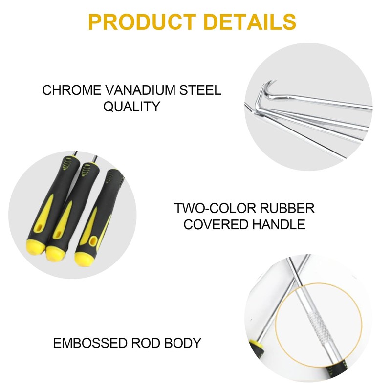 - High-quality material: The hook and pick set is made of heat-treated chrome vanadium steel for toughness and sharp tool heads for precise work.