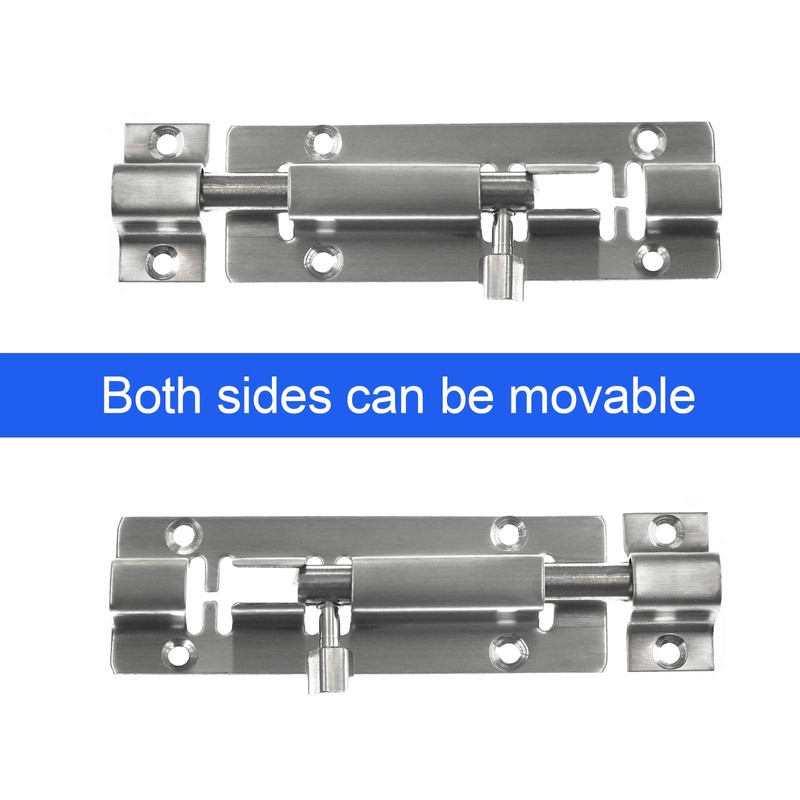 Multi-Directional InstallationSlide Latch supports installation in 360 degree, not limited by the installation angle. It can be installed vertically or horizontally, generally on both sides, that is, the bolt can be pushed left and right, and the bolt lock can also be installed up and down. Different installation directions are suitable for different places.Protect Your HomeSlide Door Bolt can provide extra security, privacy and stability for your doors and windows. It's small but will hold your door shut firmly, prevent those intruders enter.Multiple UsesDoor slide latch lock is useful for doors, chests, cabinets, wooden wickets, windows, fences, kennels, bathroom, bedroom, bar. Not only can prevent your kids or pets get out the house, but also protect your property.Heavy Duty Barrel Bolts Specifications:Material: Stainless SteelSurface Treatment: PlatingSlide Lock Dimension:Main Body Length: 100mm/3.94"Mounting Hole Diameter: 4mm/0.16"Total Size: 120 x 34 x 11mm/4.72" x 1.34" x 0.43"(L*W*H)Package Content:4 x Heavy Duty Barrel BoltsNote:Small parts are included, Not for children under 3 years old.Due to manual measurement, please allow 1-2mm difference, thanks!When you try to prevent children from opening doors or cabinets, you can install door latch lock in a high position so that children can't touch it.Door latch lock cannot really prevent an adult from forcibly breaking the door, but it can add extra security to your door.