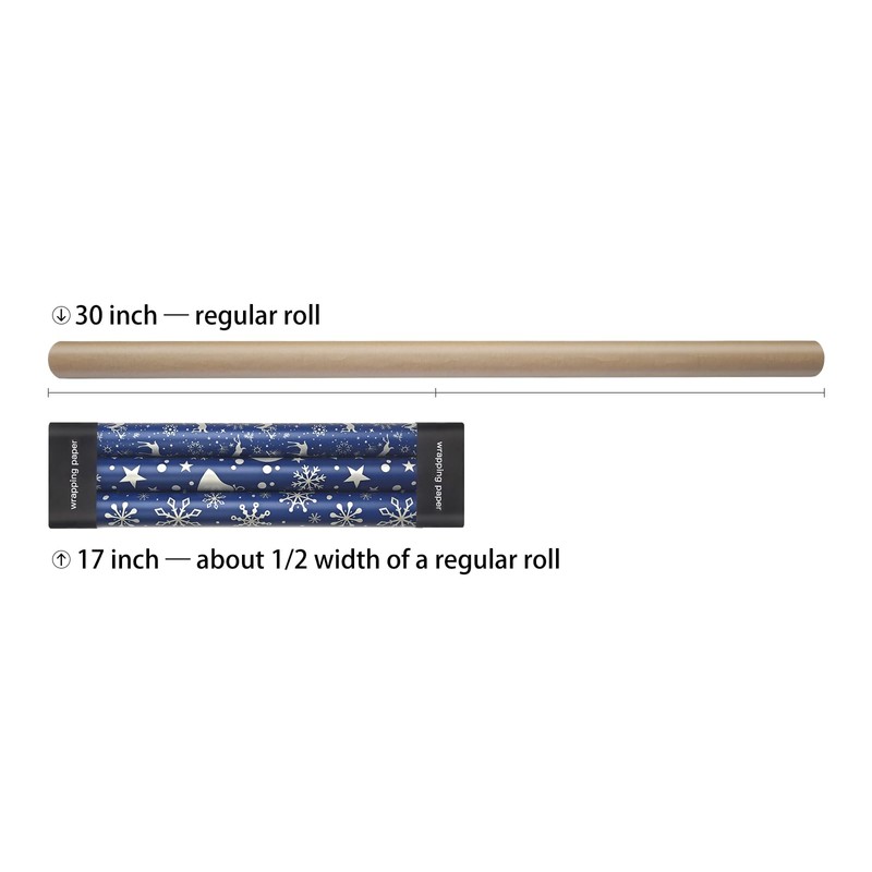 - MINI SIZE: Including 3 rolls. Each roll measures 17 inches wide and 120 inches long(42.10.sq.ft.ttl.). It is about half the width of the standard size, perfect for medium and small gifts.