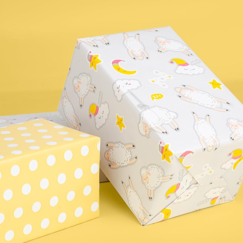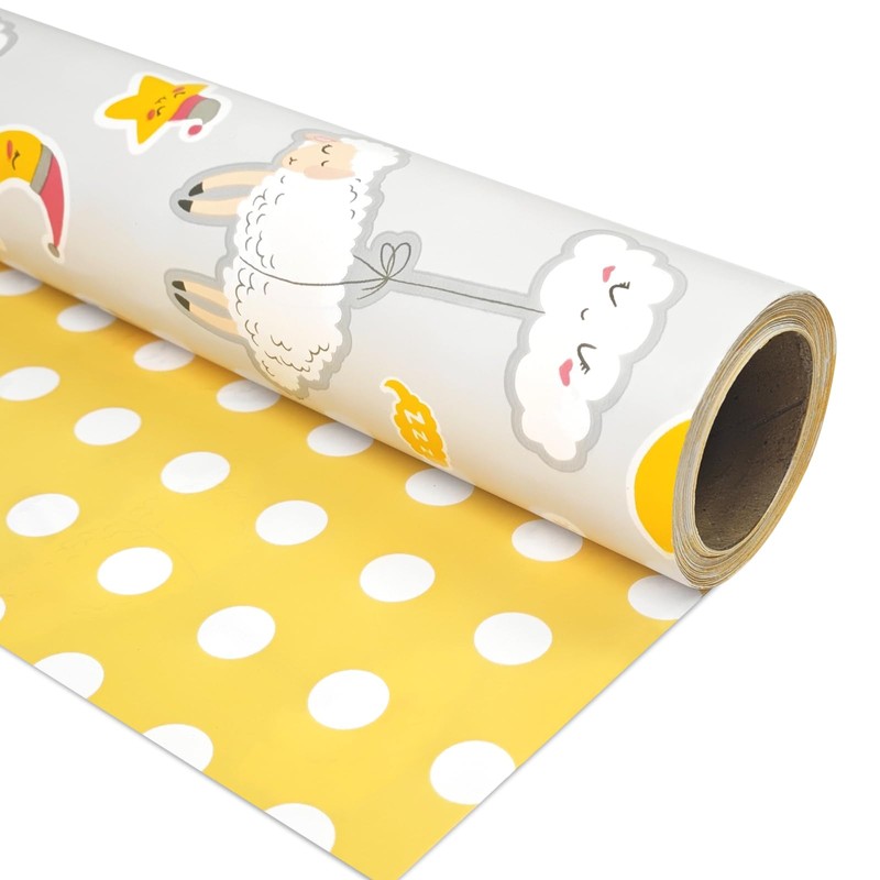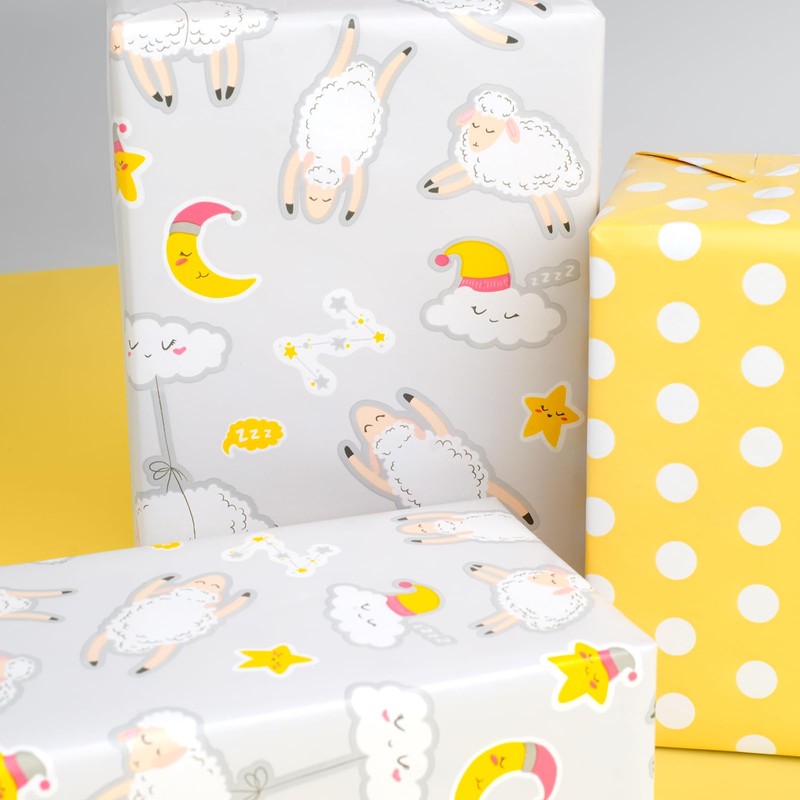 - VERSATILE DESIGNS: Each mini roll of premium wrapping paper has 2 vibrant designs: cute sheep on grey, yellow polk dots on reverse
