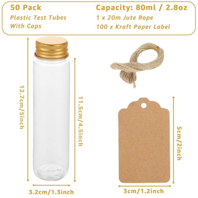 - Package Includes: Each package includes 50 pack clear test tubes, 100 pack kraft paper labels and a bundle of jute twine. The size of the plastic tubes with cap is 127 x 32mm / 5 x 1.3 inch (H x Dia.), and the capacity of the plastic tubes with caps is 80ML / 2.8oz, which is enough to store a certain amount of liquid and candy