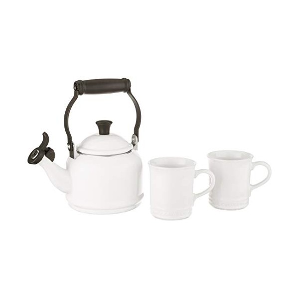 Le Creuset Enamel On Steel Demi Kettle & Stoneware Set of 2 Mugs, 1.25 qt. Kettle & (2) 14 oz. Mugs, White