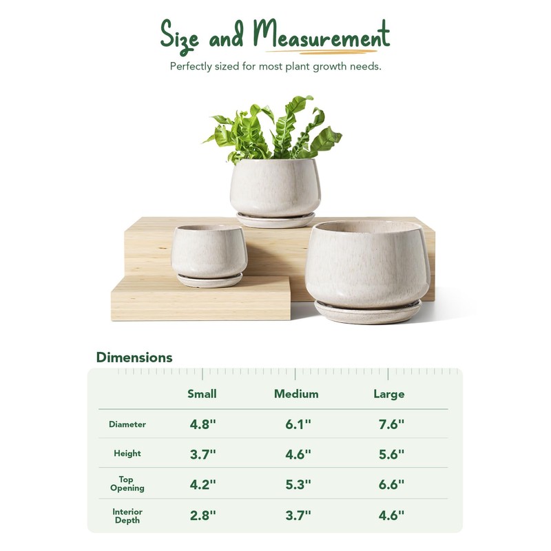 - Bringing the Garden to You with Three Plant Pots: No garden? No problem! This set offers three plant pots of different sizes, ideal for your tabletop, bedroom, or even a spacious backyard or patio; Sizes: Large - 6.5" diameter, 5.8" height; Medium - 5" diameter, 4.5" height; Small (for succulents) - 4" diameter, 3.74" height