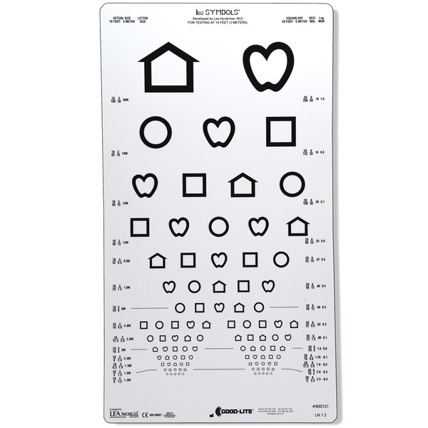LEA SYMBOLS pediatric distance chart with proportionally spaced lines; line sizes range from 20/80 to 20/8 (6/24 to 6/2.4) equivalent. This chart can be used in Good-Lite's illuminated ESV1018 or hung on the wall. Chart size 10" x 18" (25.4 cm x 45.7 cm). 10 feet, 3 meters testing distance.