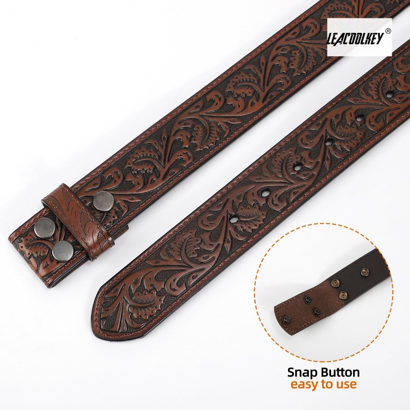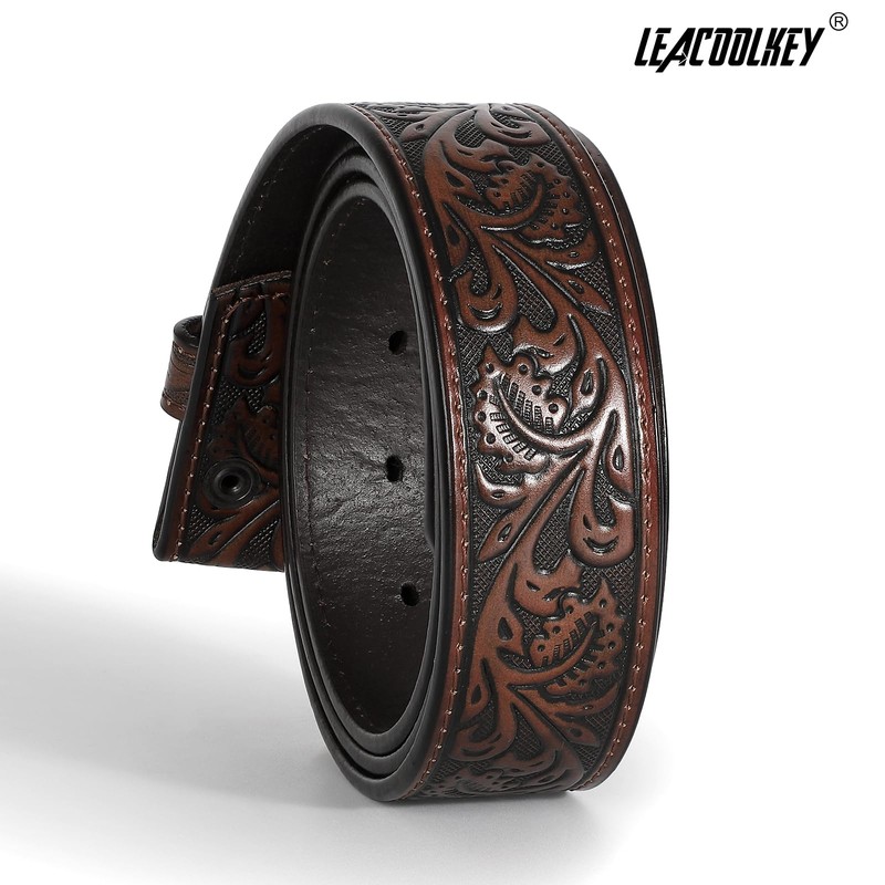 LEACOOLKEY Western Belt Strap for Men without Buckle 3.8 cm Wide Floral Engraved Embossed Leather Belt Strap, B coffee