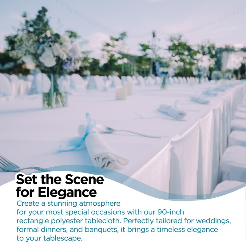 ELEVATE YOUR EVENTS WITH STYLE: These durable polyester rectangular tablecloths are designed for weddings, special gatherings, restaurant décor, corporate events, and outdoor occasions. Made from premium polyester, they blend practicality and elegance, fitting tables from 36" x 60" to 58" x 78" with a smooth, tailored fit. The 70" x 90" size ensures a polished appearance at any event, offering beauty and function. These tablecloths are machine washable, easy to maintain, and designed to withstand wrinkles and stains, making them an ideal choice for multiple uses. Their low absorbency helps manage spills, while the seamless design and serged edges create a refined, sophisticated look. The carefully finished edges prevent fraying, ensuring long-lasting durability. These affordable options provide a smart alternative to costly rentals, helping reduce expenses without compromising quality. Whether for a wedding reception, corporate gathering, or outdoor celebration, these versatile tablecloths offer a practical solution with effortless setup and removal, all while adding a touch of elegance to any occasion.