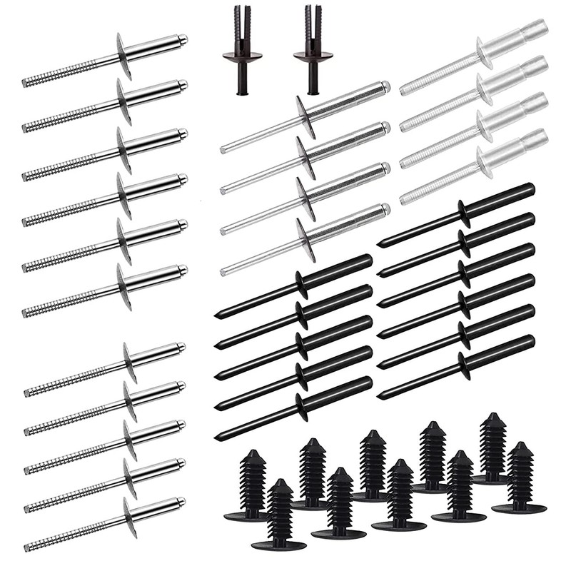 - PACKAGE---EZGO pop rivets includes 30 pcs metal rivets(aluminum rivets & stainless steel rivets), 10 pcs X-Mas plastic ratchet fastener tree rivets, 2 pcs blind drive rivets. It contains the necessary rivets and nuts required for assembling the front cowl and rear body.
