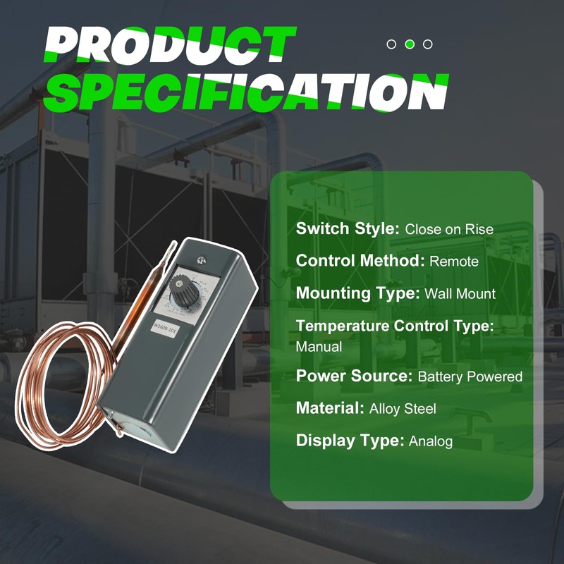 - 【PRODUCT SPECIFICATION】Temperature Control Type: Manual; Power Source: Battery Powered; Material: Alloy Steel; Display Type: analog; Control Method: Remote; Mounting Type: Wall Mount; Switch Style: Close on Rise; Bulb Size: 3/8 x 5 3/4.