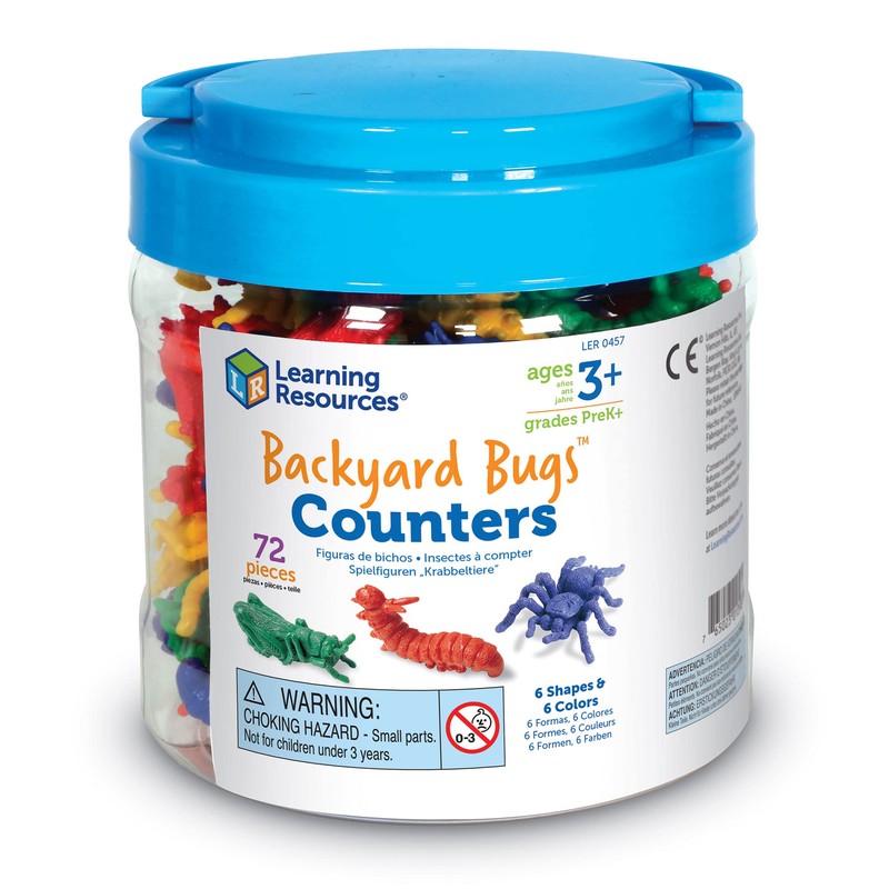 - Set of 72 counters in six colors includes grasshopper, bumblebee, beetle, spider, dragonfly, and caterpillar; all packaged in a reusable plastic tub