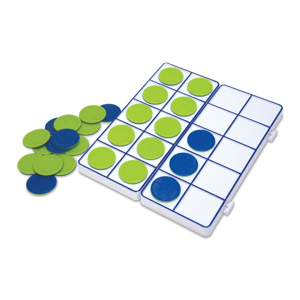 - Set comes with 10 ten-frame trays, 5 five-frame trays, 150 double-sided counters in blue/green, plus an activity guide.