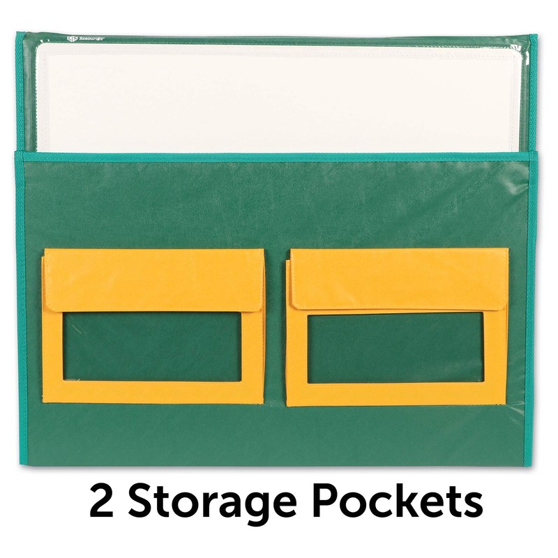 Customize your lessons with this tabletop pocket chart. It features a large write-on/wipe-off board and 2 clear sentence-strip pockets on each side, big enough for the whole class to see. Also it is great for centers. Folds for easy storage and includes durable carrying handles. Two storage pockets can hold magnetic manipulative, cards and more. Pocket chart measures 24"L x 20"H. Magnetic board on each side measures 22" L x 12-1/2" H.