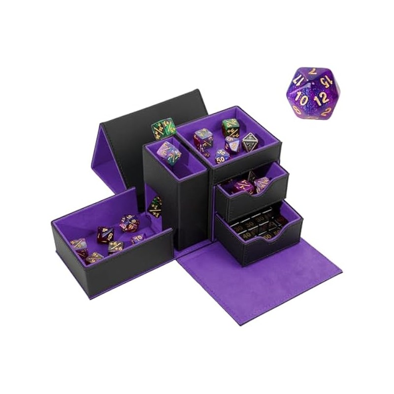 Leather Dice Tray & Tower Storage Box, 3 in 1 Dice Holder Case (Rolling Tray, Tower, Storage Drawers), Magnetic Closure DND Accessories Gifts for RPG MTG, Black/Violet