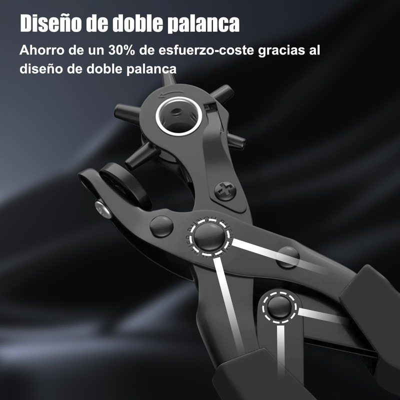 - Multifunción: El alicate tiene 6 agujeros de diferentes tamaños: 2 mm, 2,5 mm, 3 mm, 3,5 mm, 4 mm y 4,5 mm y se utiliza comúnmente para perforar agujeros redondos en cuero, cinturones, plástico, goma, lona, tela, cartón, sillines y materiales similares; especialmente útil como perforador de cuero