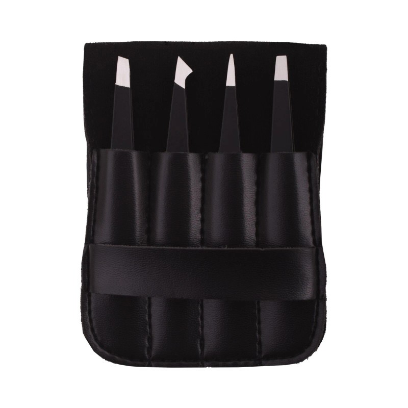 Leather Phobia 4-Piece Professional Tweezers Set – Black Stainless Steel Pluckers with Case