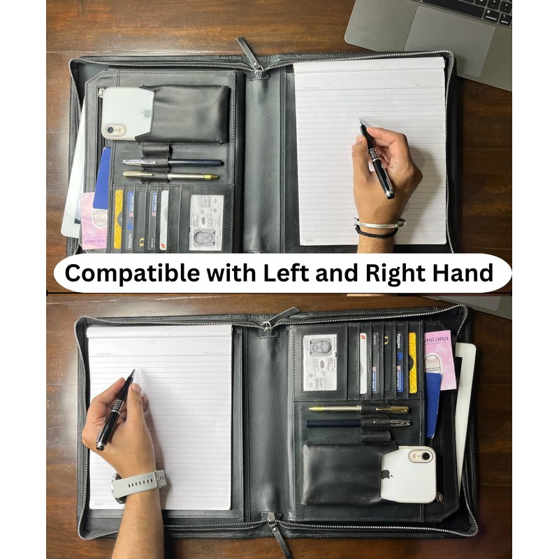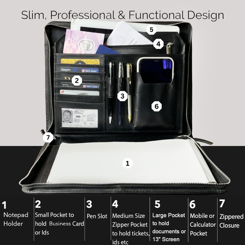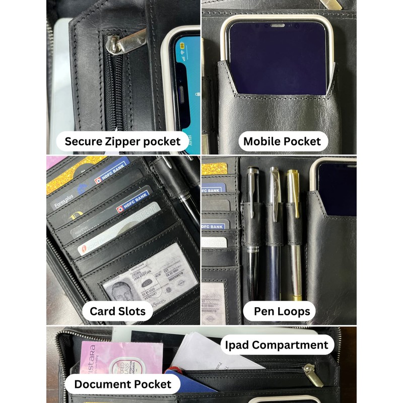 - √ VERSATILITY : It Contains 4 Large Pockets, 5 business card slots, 1 ID Slot, 3 pen holders, Mobile/Calculator Pocket and document protectors. We understand security of your digital and paper contents is important to you and this padfolio is secured with a wrap-around high duty zip and an extra inner zippered pocket to ease your mind. Whether you need a notebook portfolio for presentations, client meetings, interviews, conferences, or just managing daily tasks—we’ve got you covered