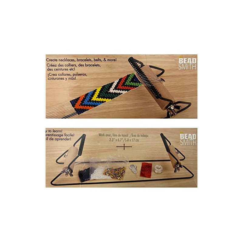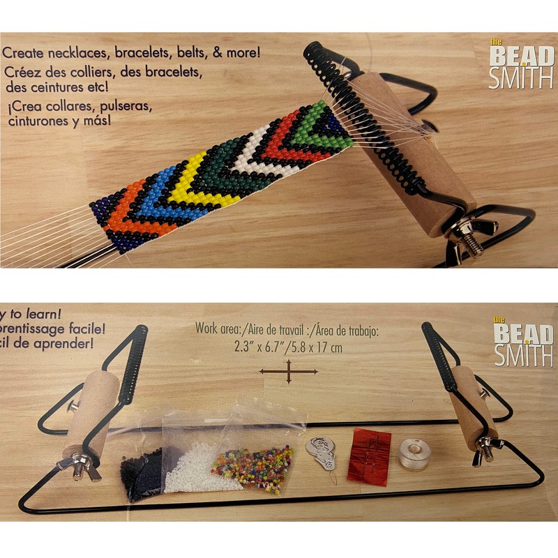 - Includes metal bead loom, 1000 assorted glass beads, 2 needles, white thread, illustrated instructions and patterns