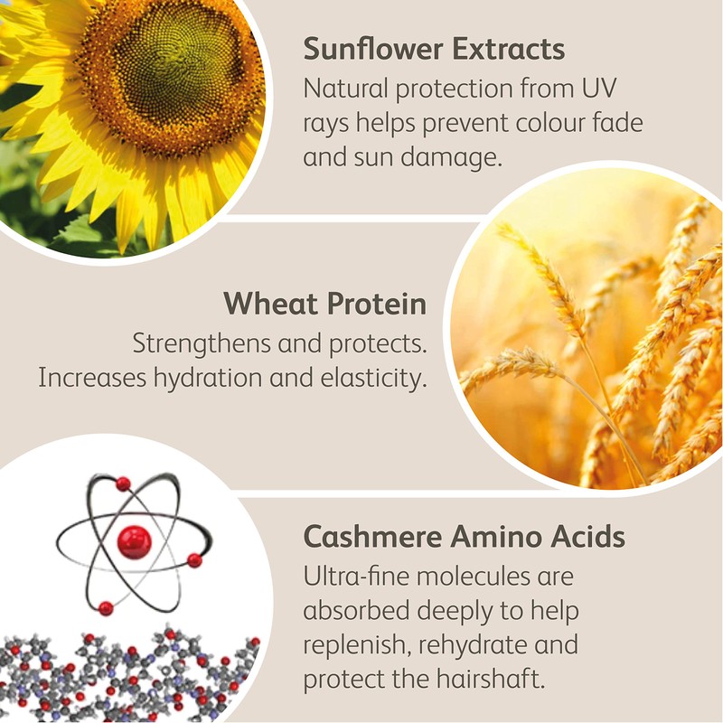 - KASCHMIR-AMINOSÄUREN. Kaschmirproteine dringen tief in den Haarschaft ein, um es zu reparieren und zu stärken, wodurch splissiges und dünner werdendes Haar reduziert wird. Die ultrafeinen Moleküle sind fast identisch mit menschlichem Haar, werden also tief absorbiert und helfen, die Hohlräume in geschädigtem Haar wieder aufzufüllen, den Haarschaft zu rehydrieren und vor weiterem Schrumpfen zu schützen.