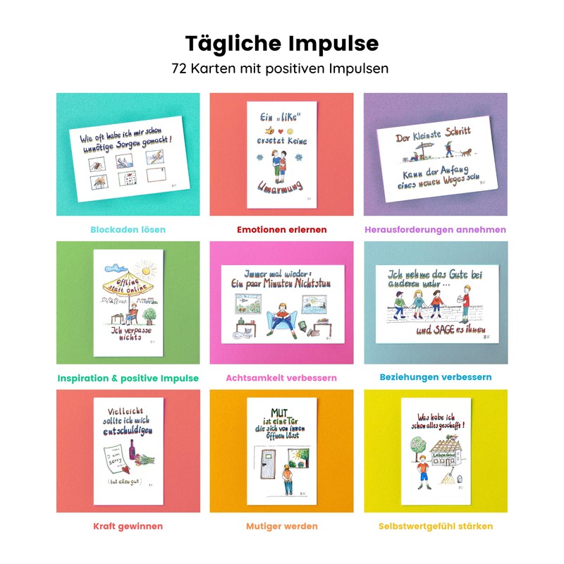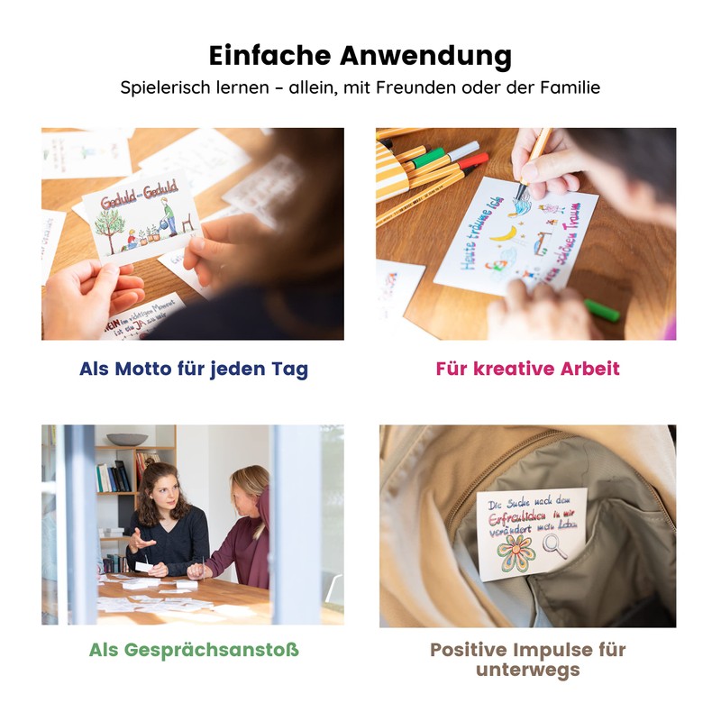 - Versatile - Popular as affirmation cards, inspiration cards, resource cards or as therapy cards for reframing, conversations in coaching, support groups and psychotherapy.