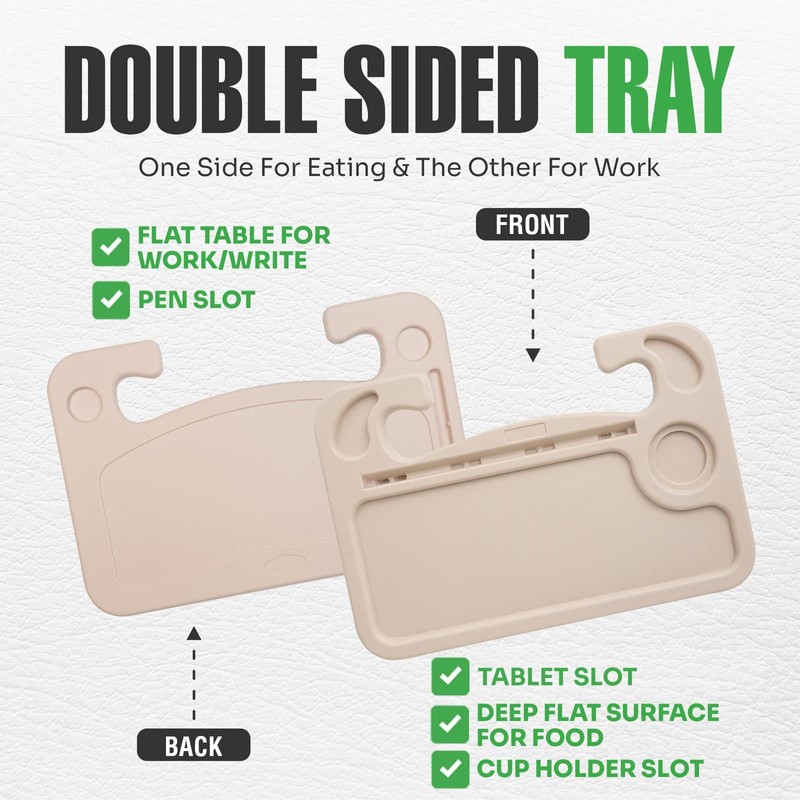 - ▶ Supreme Design - Our 2-Sides Steering Wheel Desk hooks onto the bottom of the steering wheel, creating an ergonomic table. One side is for food with a deep, flat surface and cup holder, the other is for work with a flat table and pen slot.