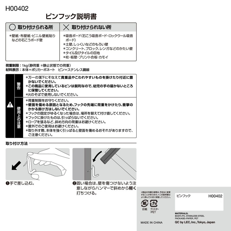 LEC Pin Hooks, Pack of 4, Load Capacity 2.2 lbs (1 kg), Black