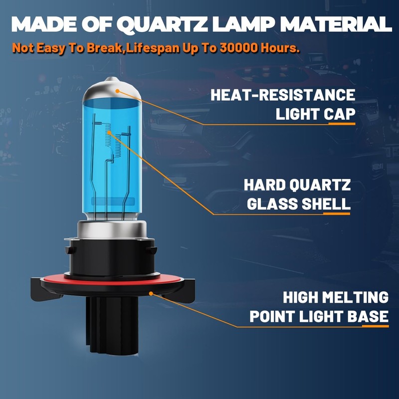 The 9008 low and high beam Halogen Bulb is filhalogen with Xenon gas, which helps helps to slow down the process of oxidizing the tungsten inside.The Halogen bulbs lifespan can reach more than 30,000 hours.