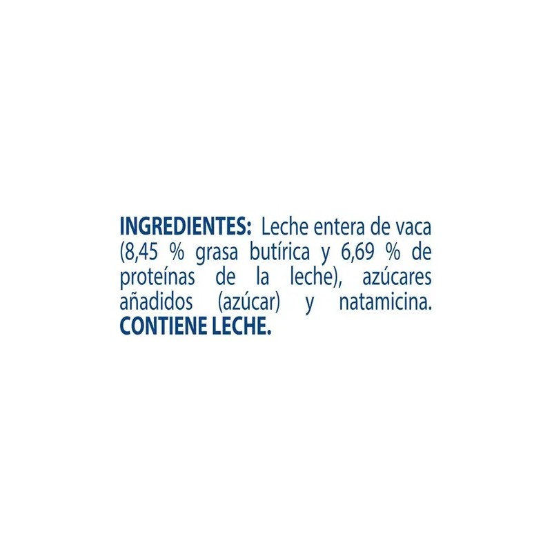 - Ingredientes: leche entera de vaca (8,45 % grasa butírica y 6,69 % de proteínas de la leche), azúcar y natamicina