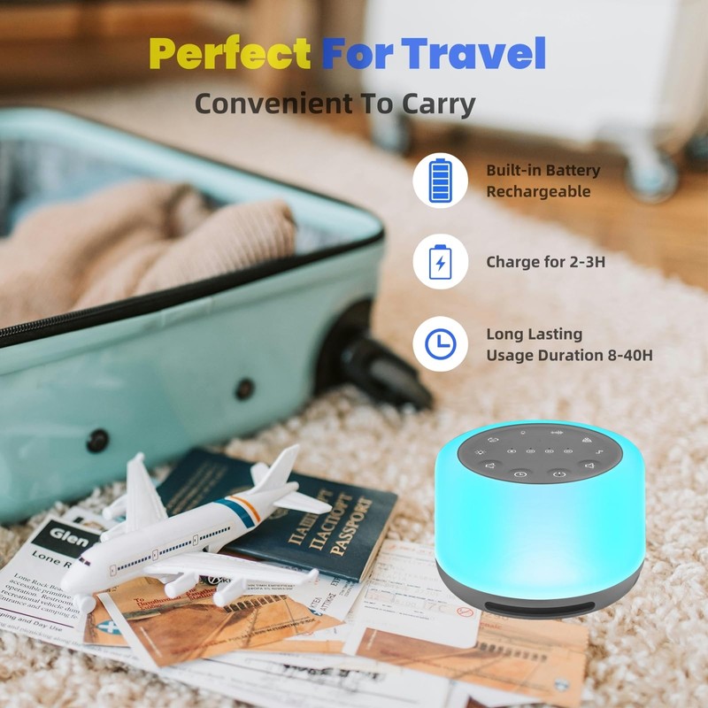 - 【Rechargeable & Long Battery Life】The portable sounds machine can be used for 8-40H(According to the brightness of the light and the volume) continiously when fully charged(Takes 2-3H to be fully charged). NOTE: The product is equipped with a USB charging cable and no adapter. Please charge it with 5V adapter.
