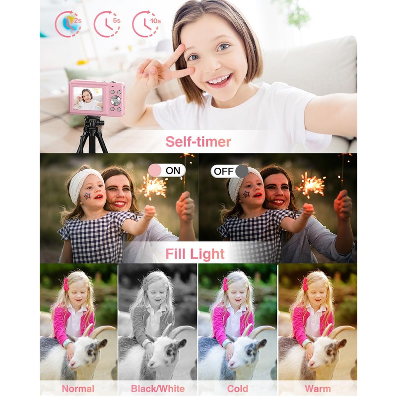 - Meaningful Gift - This pink digital camera for kids is equipped with a high-level CMOS Sensor and anti-shake function, which helps to capture vivid clear 44MP Images and record stable smooth FHD 1080P resolution videos. It's a meaningful Christmas or birthday gift camera for kids to cultivate their interest in photography, experience the lovely life, and leave funny memorable moments with family or friends.