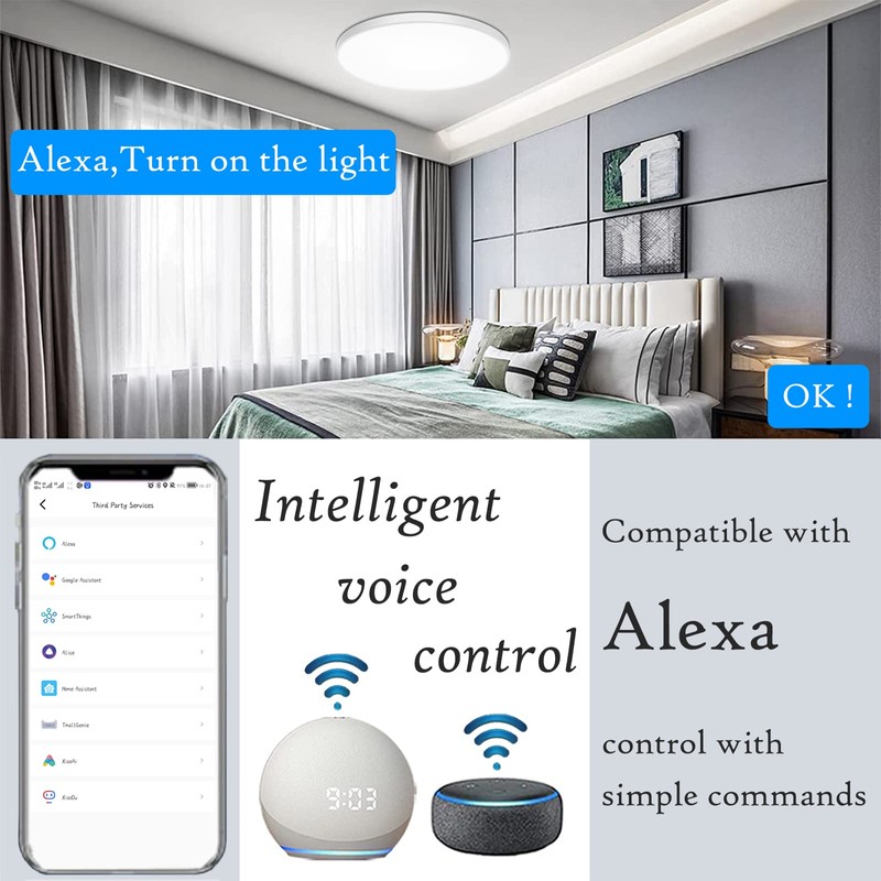 - Voice control: In addition, the intelligent ceiling light can be easily controlled via voice commands to turn on/off, dim/illuminate your lights and even change the lights to specific colours as needed. Even if you are not at home, you can control the Alexa ceiling light via the app.
