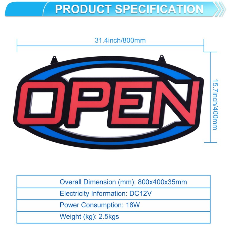 - {FEATURES} - This Open sign offers “Static” , “Five-speed Flash and Scroll” to attract customer's attention. Switch between two different functions, static or blinking, delivering the eye-catching intensity to power through dark tinted windows.