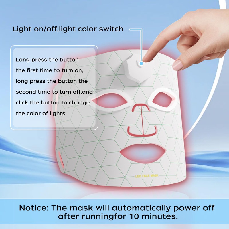 • 【User-friendly】Long press the button on the head, this red light therapy mask can be switched on, off and switch Light mode, easy to use; In addition, our mask will automatically power off after 10 minutes of operation to prevent prolonged exposure to infrared rays, which can cause skin damage