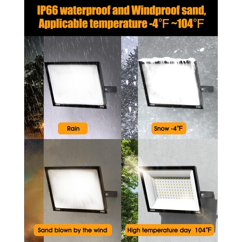 - IP66 Waterproof and Dustproof:IP66 waterproof and dustproof: suitable for rain, wind and sand, low temperature -4℉, high temperature 144℉ and other kinds of severe weather working environment.Great LED outdoor flood lights for barn ,front porch, factories, docks, squares, stadiums and other places where lighting is needed