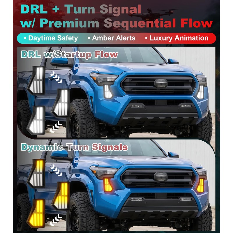 - [Dual Functionality]: The 2024-2025 Tacoma fang lights combine white DRL daytime running lights and amber sequential turn signals in one sleek front bumper light kit, providing superior visibility in fog, rain, or snow. It also fetures white DRL w/ start animation.