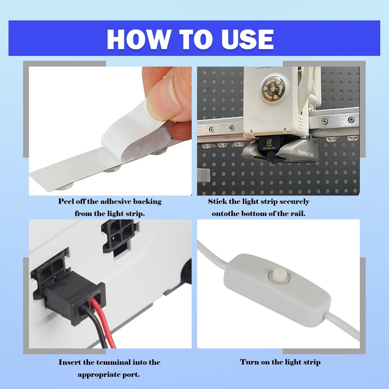 - Easy installation: No tools or complicated settings are required, just attach Led Light Strip Compatible With Bambu-Lab A1 to the printer, installation is quick and easy, and it can be fixed to the bottom of the X-axis aluminum profile after peeling off the backing.