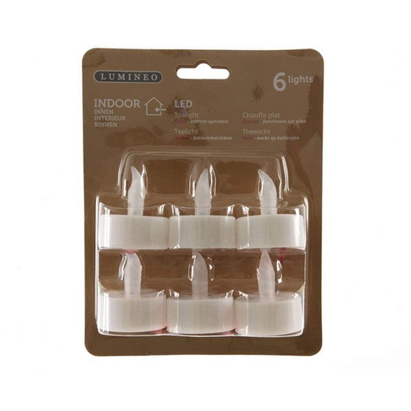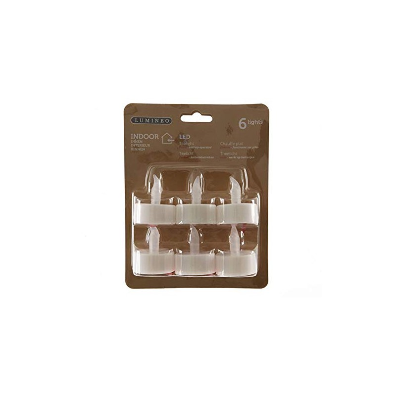 - Lumineo Pack Of 6 Indoor LED Battery Operated Plastic Tealight Flame Candles 4cm x 4.5cm Approx Non replaceable bulbs Min 50 000 Hour life Requires 1 x CR2032 Battery - Included per candle.