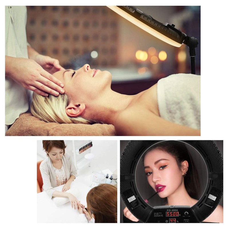 - 【Powerful Ring Light】Ring lights have a very good performance in shooting, fill light, etc. Boasting 480pcs high performance leds, bright enough for 96w, Bi-color tempreture can be adjusted, 0-100% dimmable, can do almost any fill light job.
