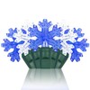 - 35 blue and cool white LED snowflake lights spaced 6” apart on green wire, 18’ total string length