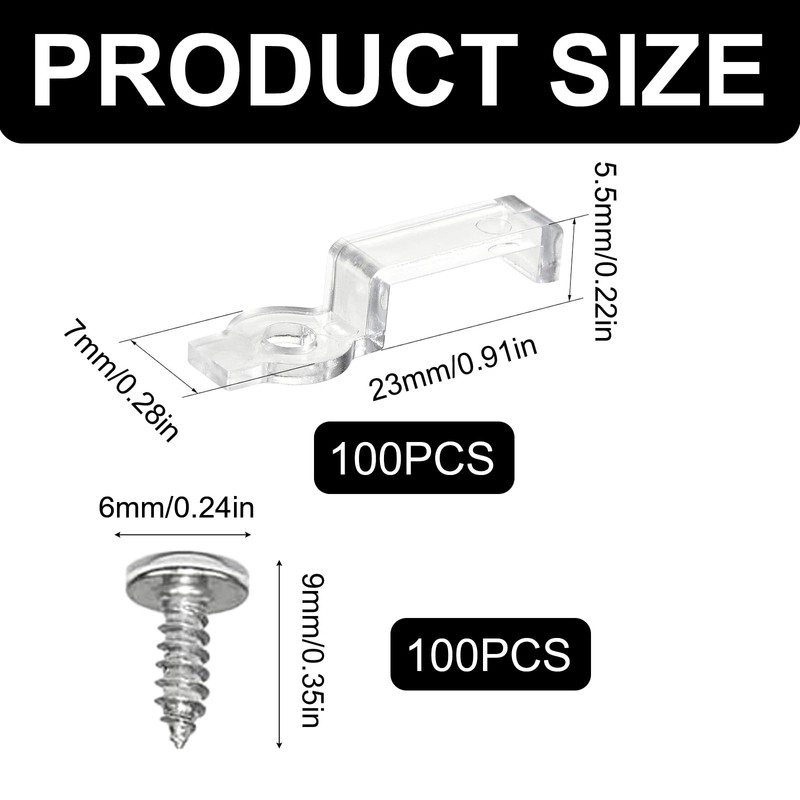 - Light mounting bracket clips: you will receive 100 transparent mounting clips and 200 screws, mainly for attaching LED strips, but also as a USB cable organiser or for anything else you want to organise at home.
