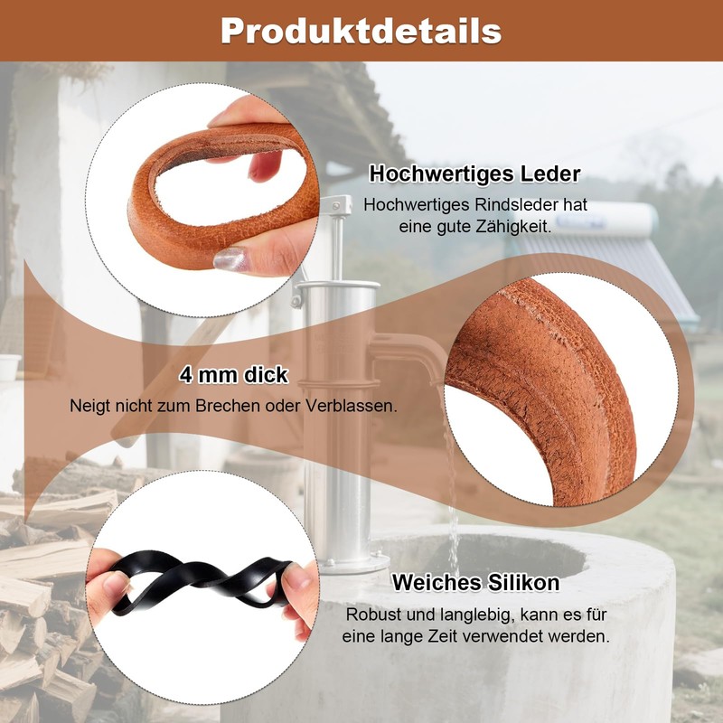 Diese schwengelpumpen-ersatzteile bestehen aus hochwertigem rindsleder und caoutchouc, sind weich und langlebig, geruchsneutral, haben gute dichtungseigenschaften und halten einer langfristigen verwendung stand.