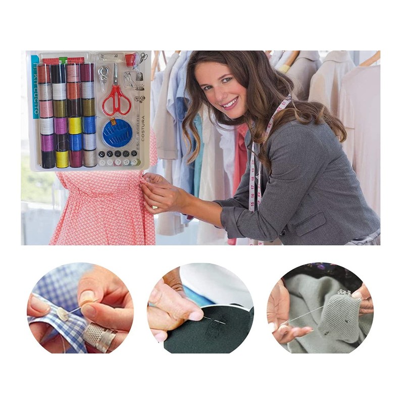 - Sewing kit with 24 assorted thread spools, scissors, buttons, needles, tape measure, threader, needles and thimble