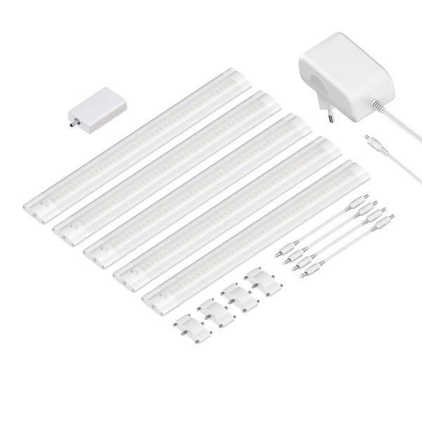 5 x LED under-unit lights, ballast with 1.5 m cable, 4 x 10 cm connection cables, mounting clips, double-sided tape, 1 x WiFi dimmer.