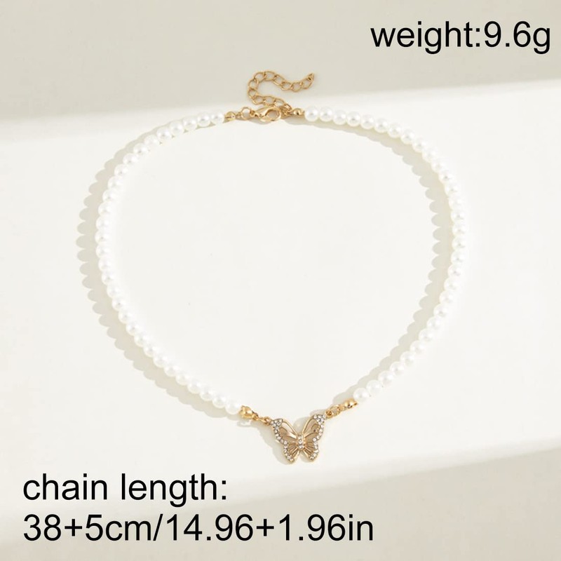 LEEQ Butterfly Pearl Necklace for Women, Rhinestone Necklaces, Round White Simulated Shell Pearl Necklace, Festival, Birthday Party Necklace, Jewellery for Women and Girls