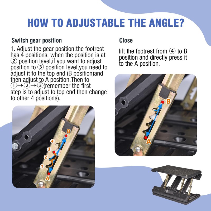 - Friendly Notice: Please refer to the video about how to operate the footrest!!When you sitting on the stool, you cannot sit on the edge of the panel , the max load weight cannot exceed 120 pounds.Life is precious, cherish health, care for the body, take care of your legs and feet, both work at home,in office,this footrest is the ideal choice. You deserve it.